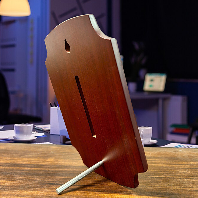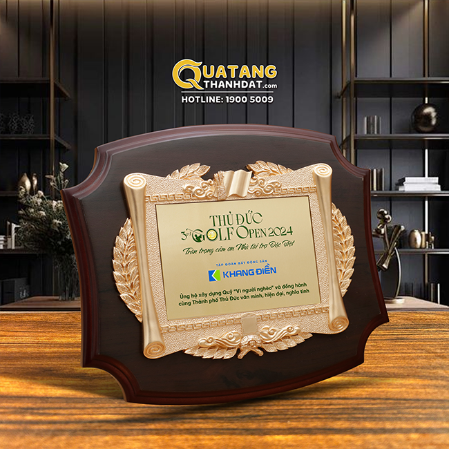 Bảng vinh danh nhà tài trợ có thiết kế viền và mặt sau là gỗ, mặt sau có thiết kế chân chống trượt và lỗ treo tường. Mặt trước được mạ vàng đồng nổi làm nổi bật các chữ trong bảng vinh danh, làm cho món quà của bạn tăng thêm độ thẩm mỹ cũng như sự sang trọng mà bảng vinh danh mạ vàng mang lại